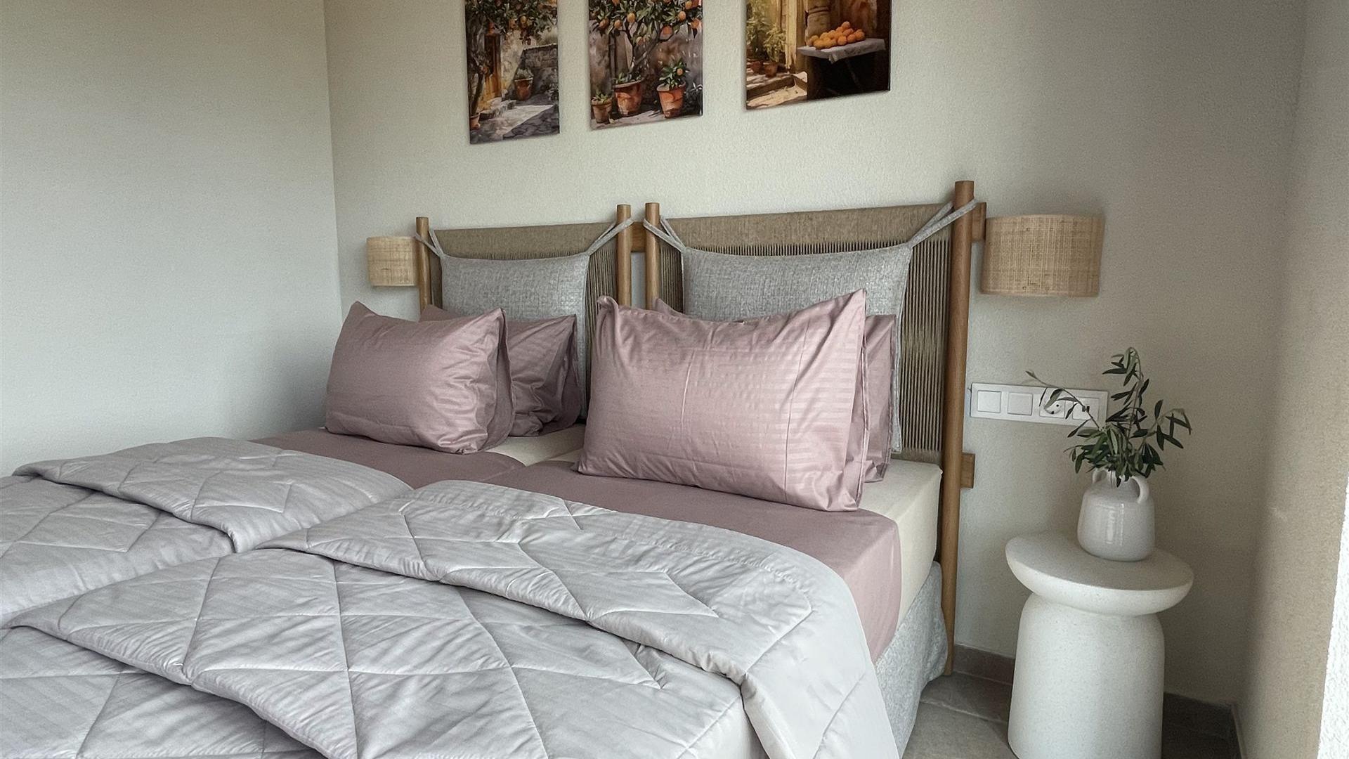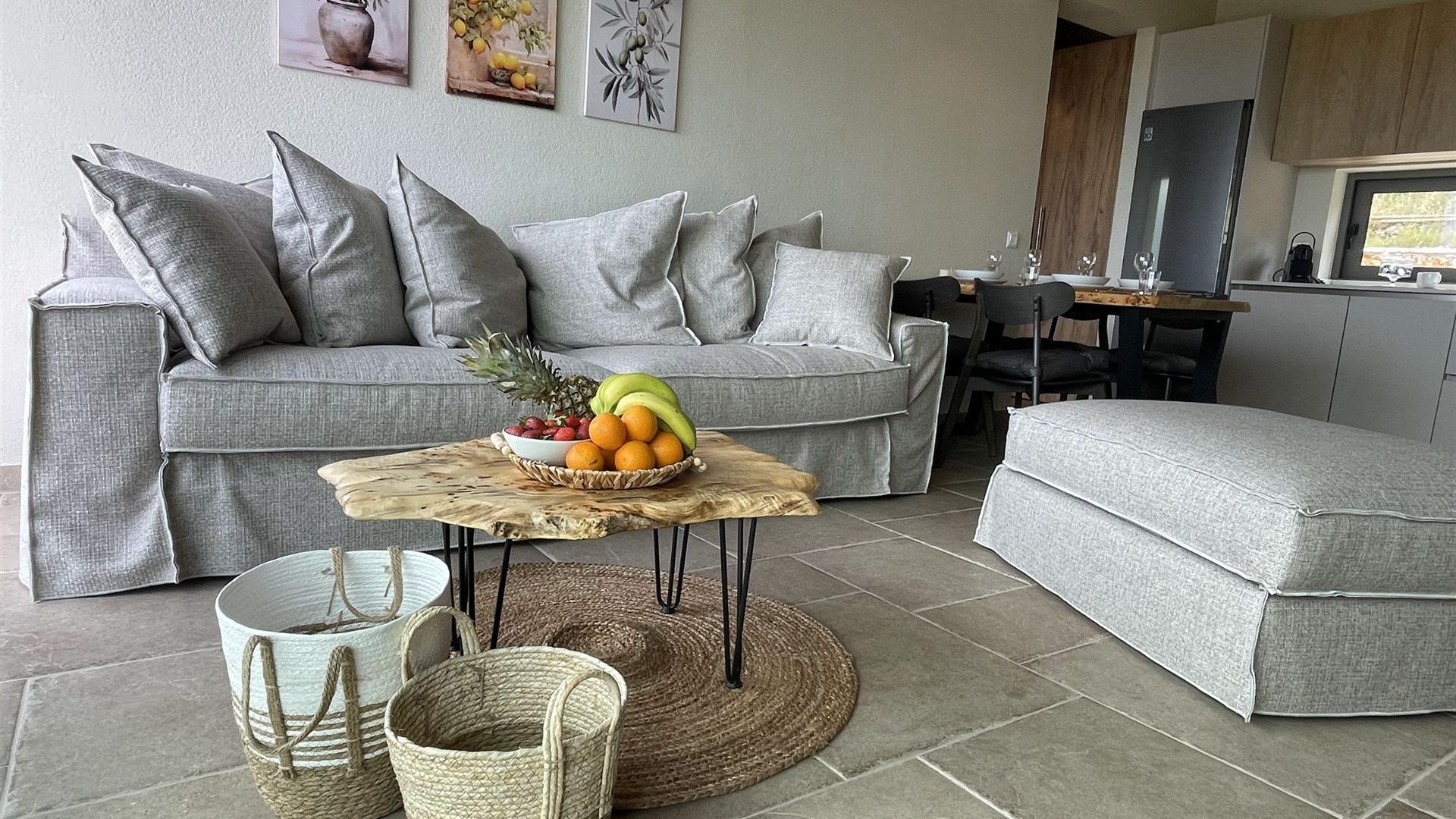 The villa can accommodate 4 people. There are two bedrooms, one with a double bed and the second with two single beds. There is also a sofa bed in the living room.
